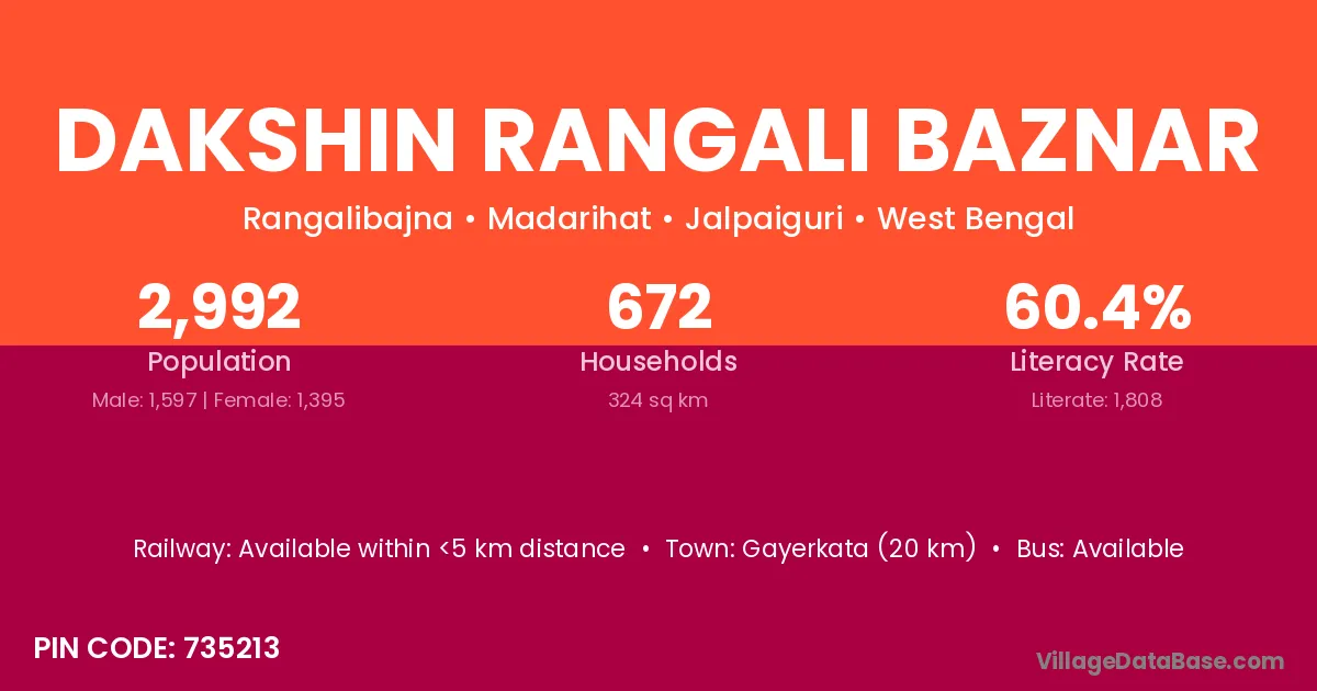 Gayerkata (20 km) is the nearest town to Dakshin Rangali Baznar village for major economic activities and is located approximately 20 km away.