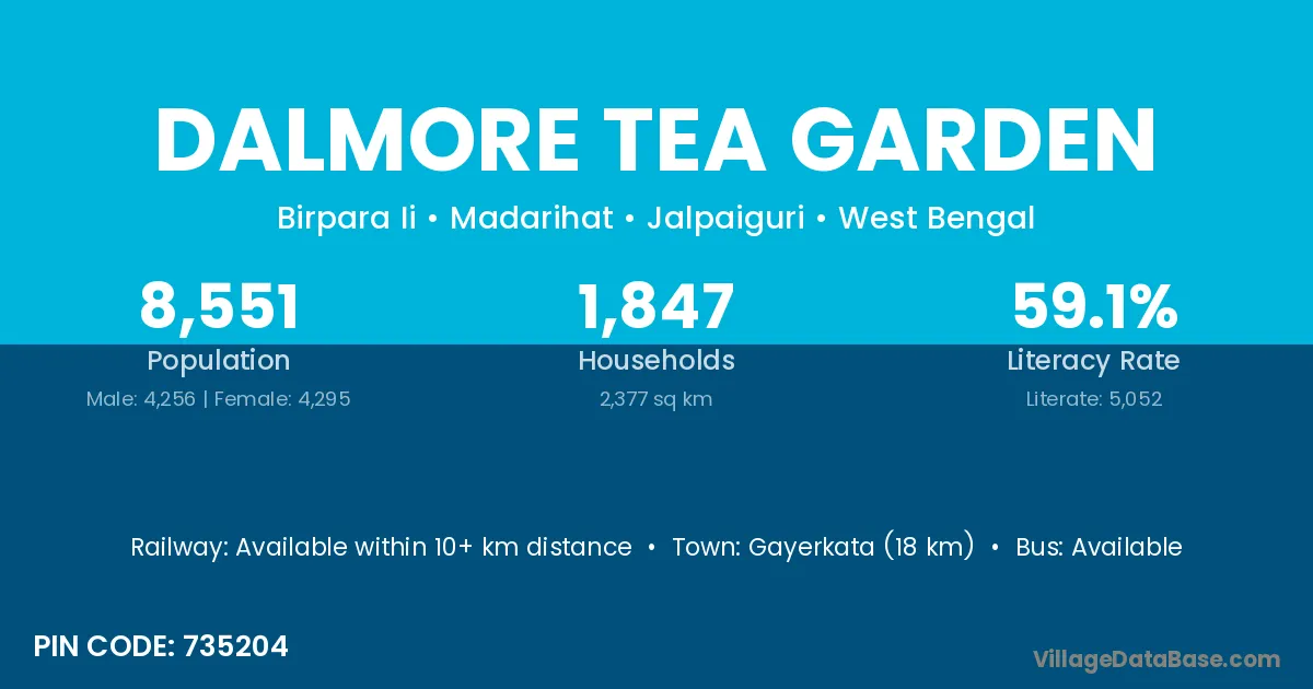 Gayerkata (18 km) is the nearest town to Dalmore Tea Garden village for major economic activities and is located approximately 18 km away.