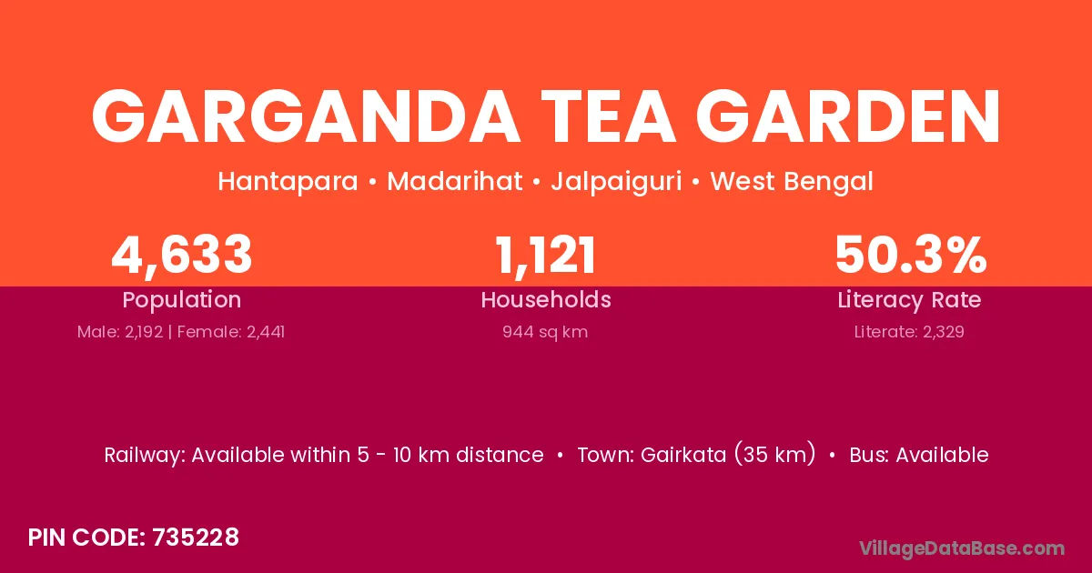 Gairkata (35 km) is the nearest town to Garganda Tea Garden village for major economic activities and is located approximately 35 km away.