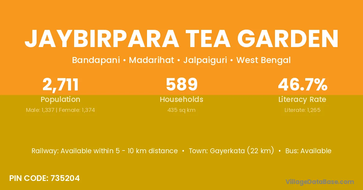 Gayerkata (22 km) is the nearest town to Jaybirpara Tea Garden village for major economic activities and is located approximately 22 km away.