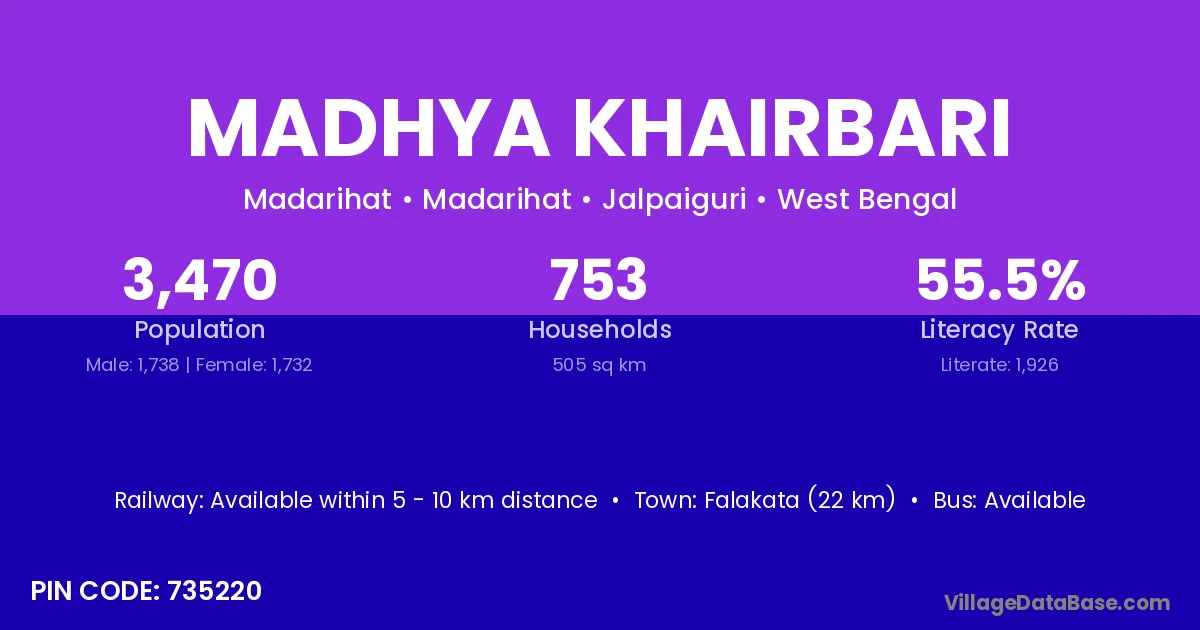 Falakata (22 km) is the nearest town to Madhya Khairbari village for major economic activities and is located approximately 22 km away.