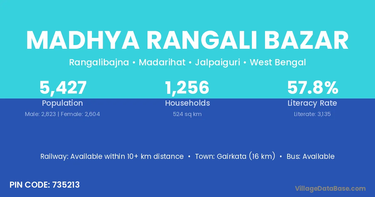 Madhya Rangali Bazar village has a total population of 5,427 people, of which 2,823 are males and 2,604 are females.