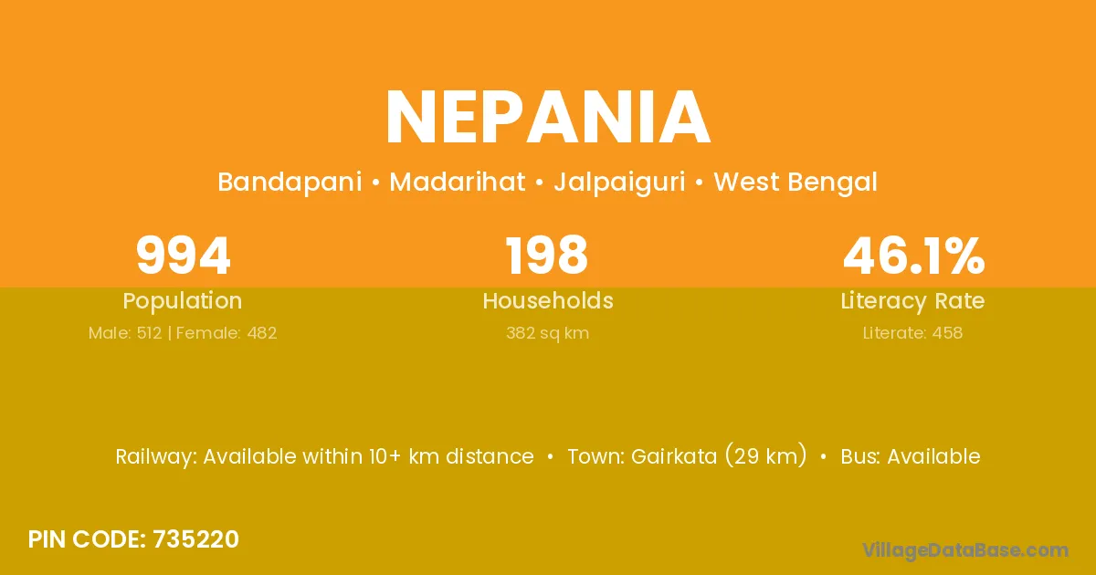 Gairkata (29 km) is the nearest town to Nepania village for major economic activities and is located approximately 29 km away.