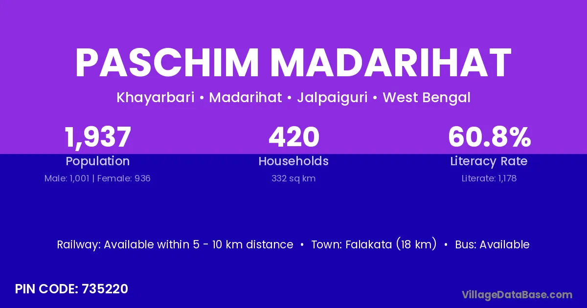 Falakata (18 km) is the nearest town to Paschim Madarihat village for major economic activities and is located approximately 18 km away.