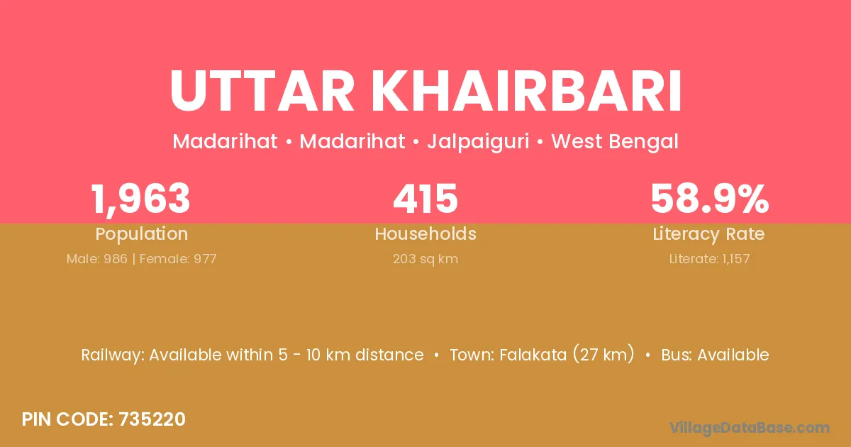 Falakata (27 km) is the nearest town to Uttar Khairbari village for major economic activities and is located approximately 27 km away.