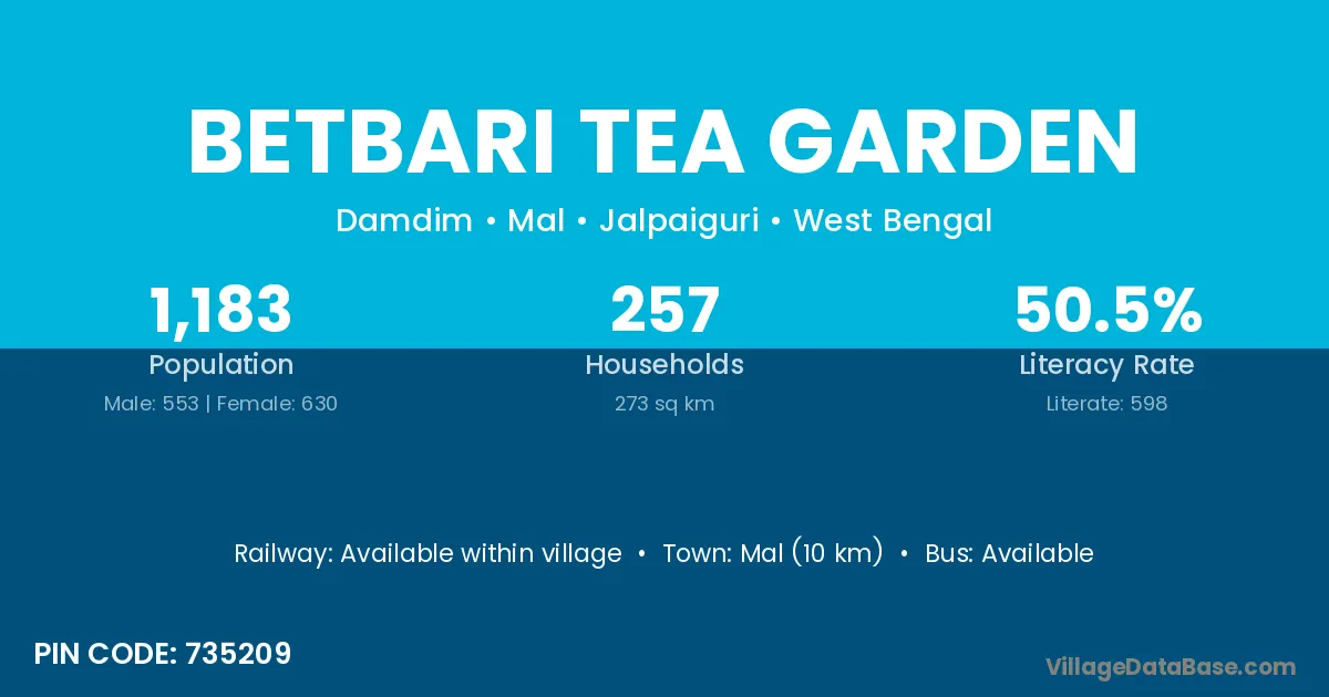 Betbari Tea Garden village has a total population of 1,183 people, of which 553 are males and 630 are females.