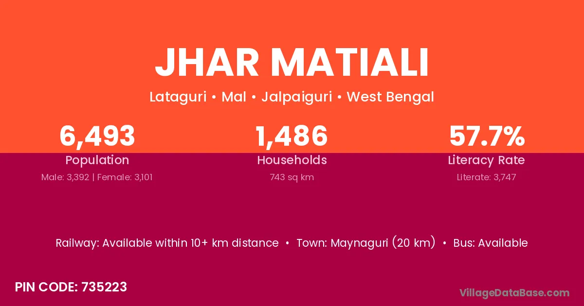 Jhar Matiali village has a total population of 6,493 people, of which 3,392 are males and 3,101 are females.
