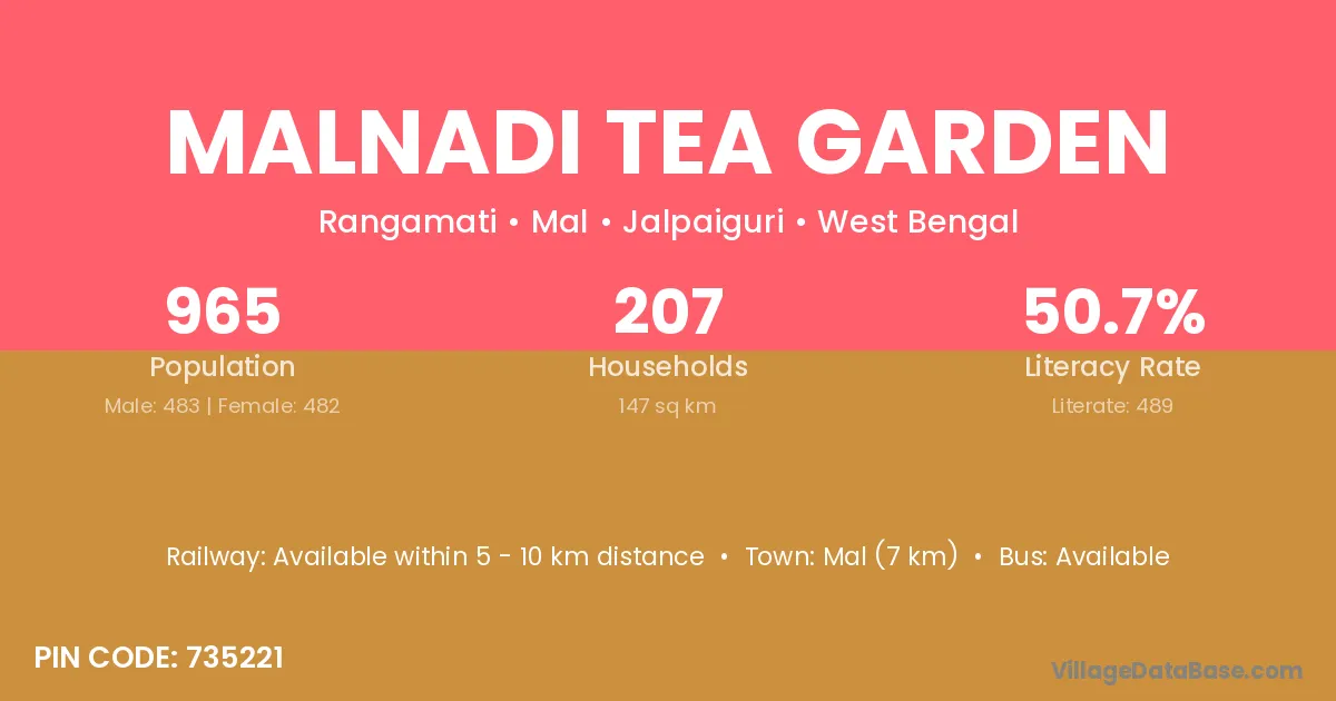 Malnadi Tea Garden village has a total population of 965 people, of which 483 are males and 482 are females.