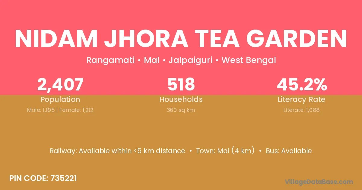 Nidam Jhora Tea Garden village has a total population of 2,407 people, of which 1,195 are males and 1,212 are females.