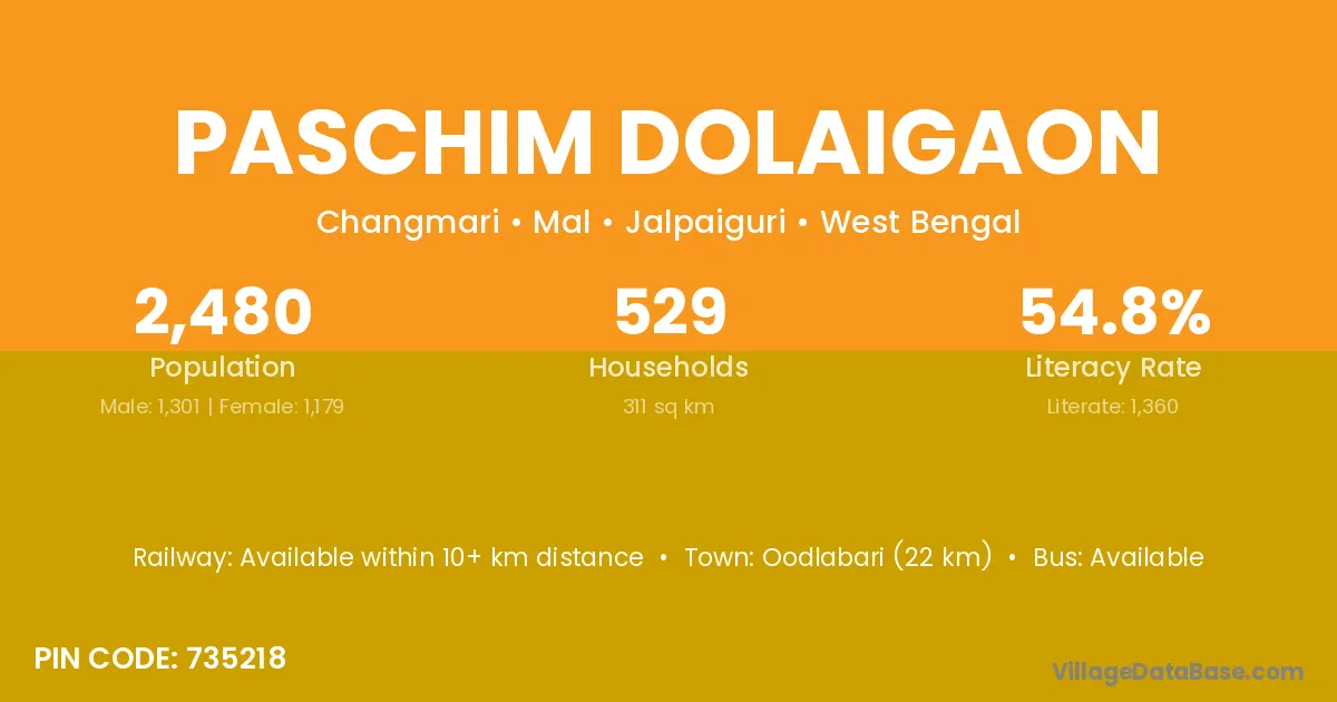 Oodlabari (22 km) is the nearest town to Paschim Dolaigaon village for major economic activities and is located approximately 22 km away.