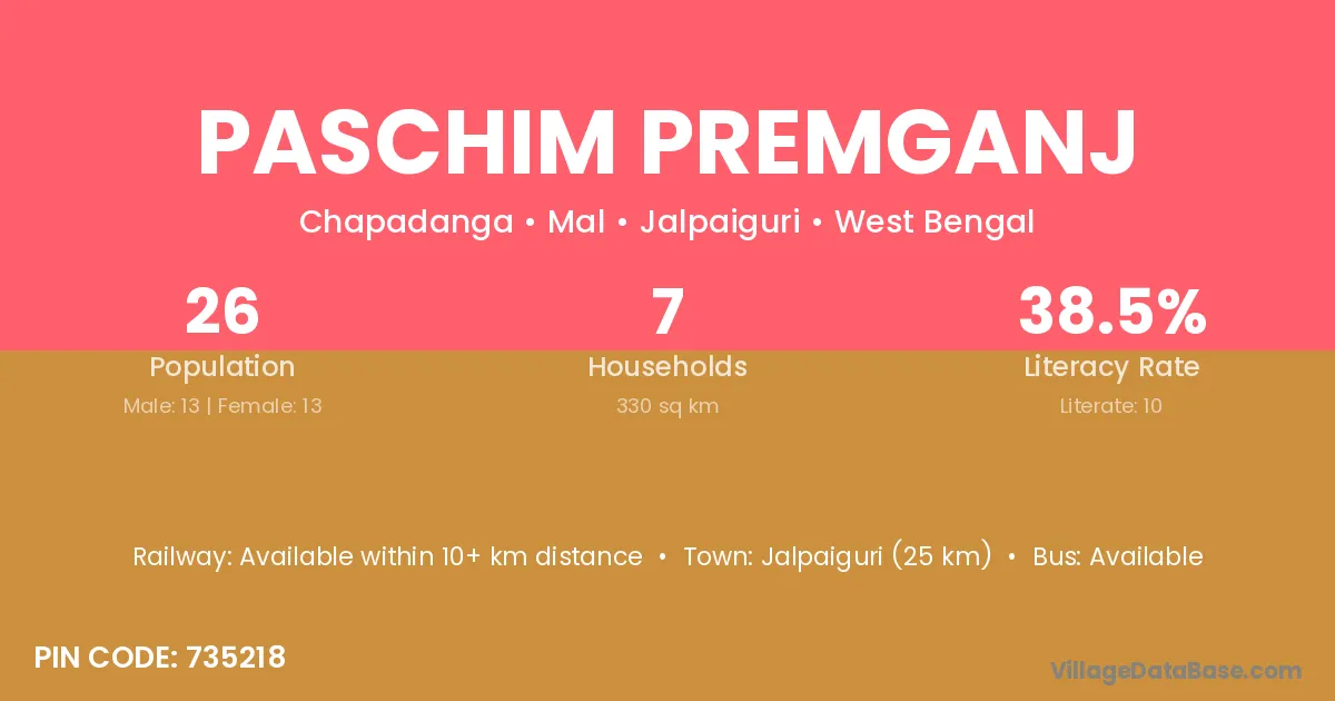 Jalpaiguri (25 km) is the nearest town to Paschim Premganj village for major economic activities and is located approximately 25 km away.