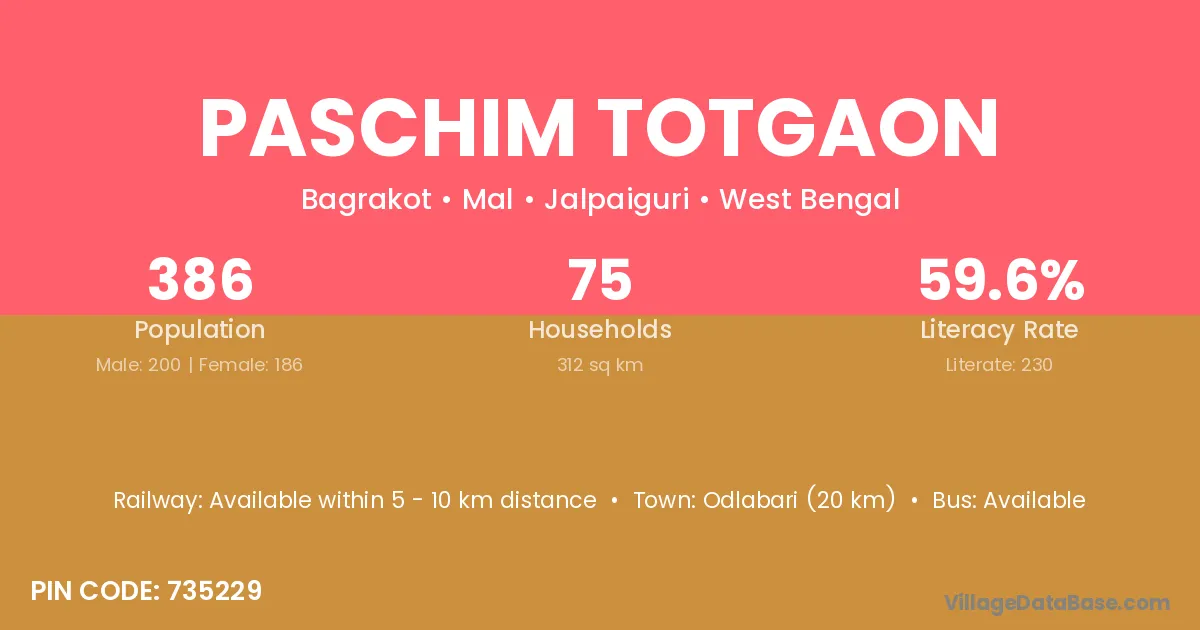 Paschim Totgaon village has a total population of 386 people, of which 200 are males and 186 are females.