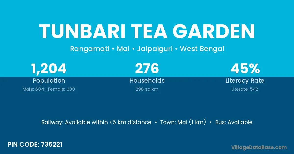 Mal (1 km) is the nearest town to Tunbari Tea Garden village for major economic activities and is located approximately 1 km away.