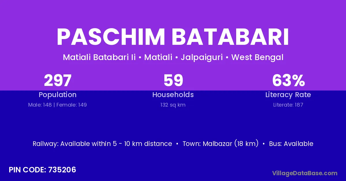 Malbazar (18 km) is the nearest town to Paschim Batabari village for major economic activities and is located approximately 18 km away.