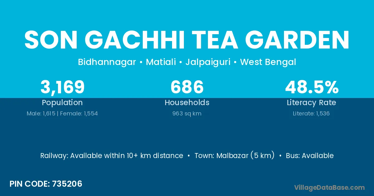 Malbazar (5 km) is the nearest town to Son Gachhi Tea Garden village for major economic activities and is located approximately 5 km away.