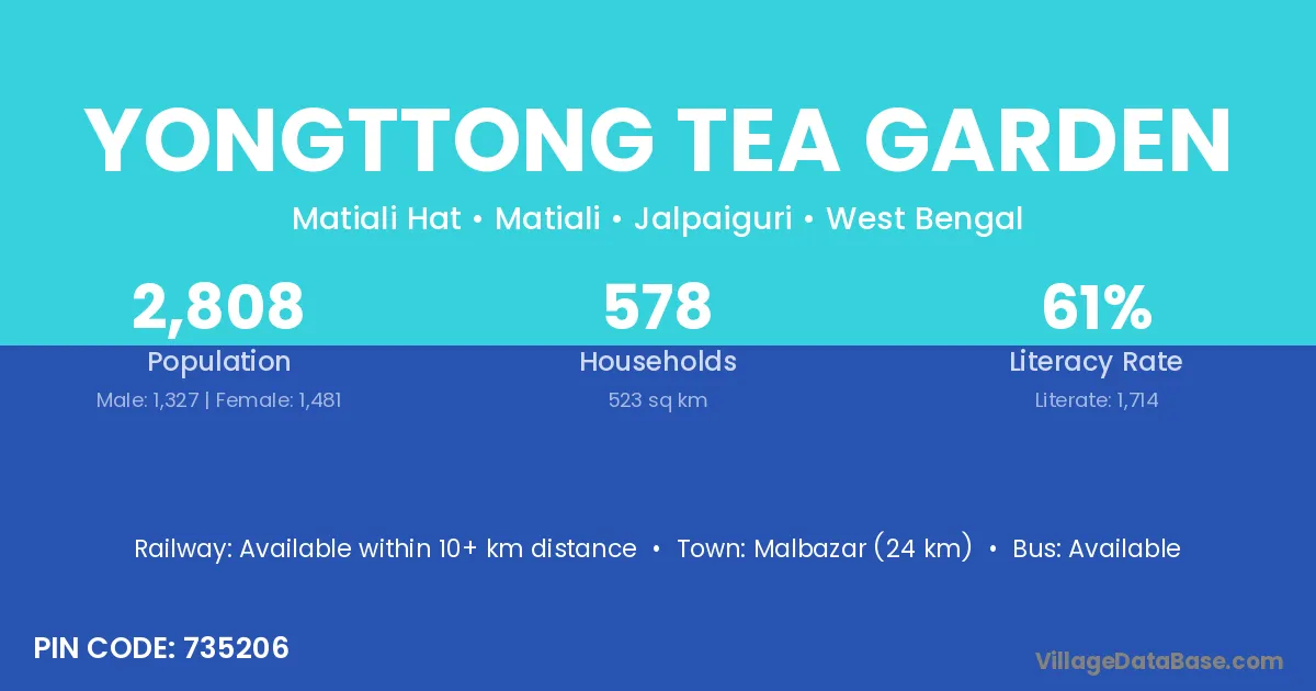 Malbazar (24 km) is the nearest town to Yongttong Tea Garden village for major economic activities and is located approximately 24 km away.
