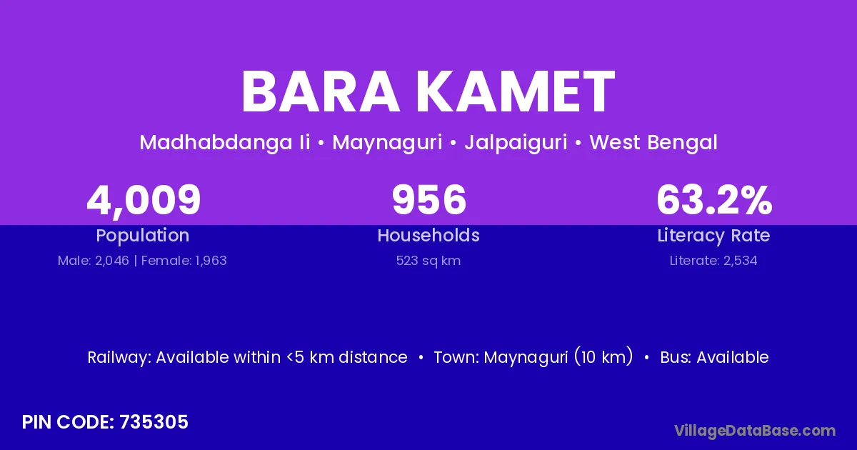 Maynaguri (10 km) is the nearest town to Bara Kamet village for major economic activities and is located approximately 10 km away.