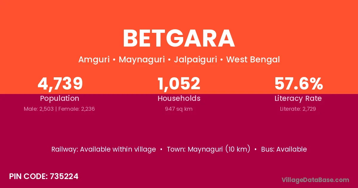 Maynaguri (10 km) is the nearest town to Betgara village for major economic activities and is located approximately 10 km away.