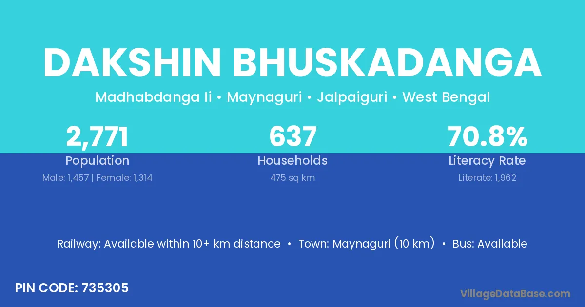 Maynaguri (10 km) is the nearest town to Dakshin Bhuskadanga village for major economic activities and is located approximately 10 km away.