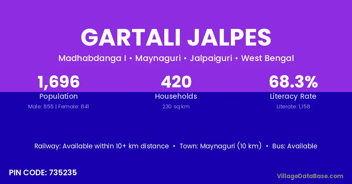 Maynaguri (10 km) is the nearest town to Gartali Jalpes village for major economic activities and is located approximately 10 km away.