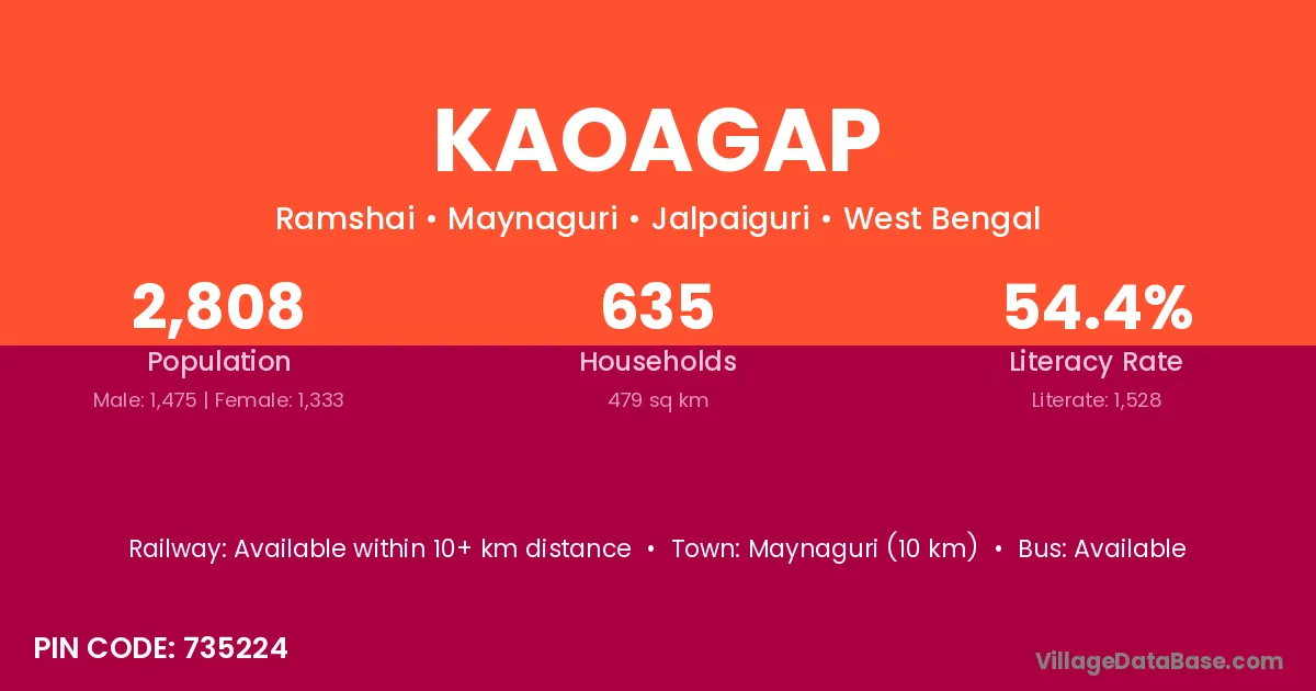 Maynaguri (10 km) is the nearest town to Kaoagap village for major economic activities and is located approximately 10 km away.