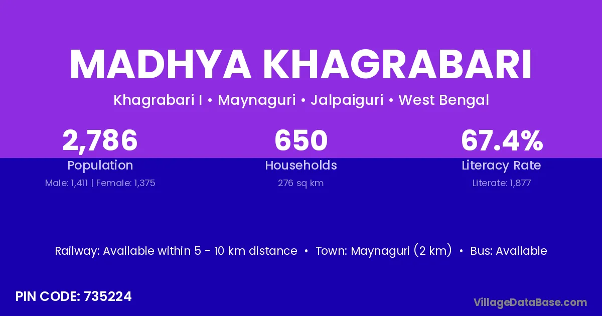 Maynaguri (2 km) is the nearest town to Madhya Khagrabari village for major economic activities and is located approximately 2 km away.