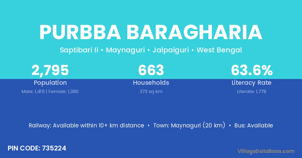 Maynaguri (20 km) is the nearest town to Purbba Baragharia village for major economic activities and is located approximately 20 km away.