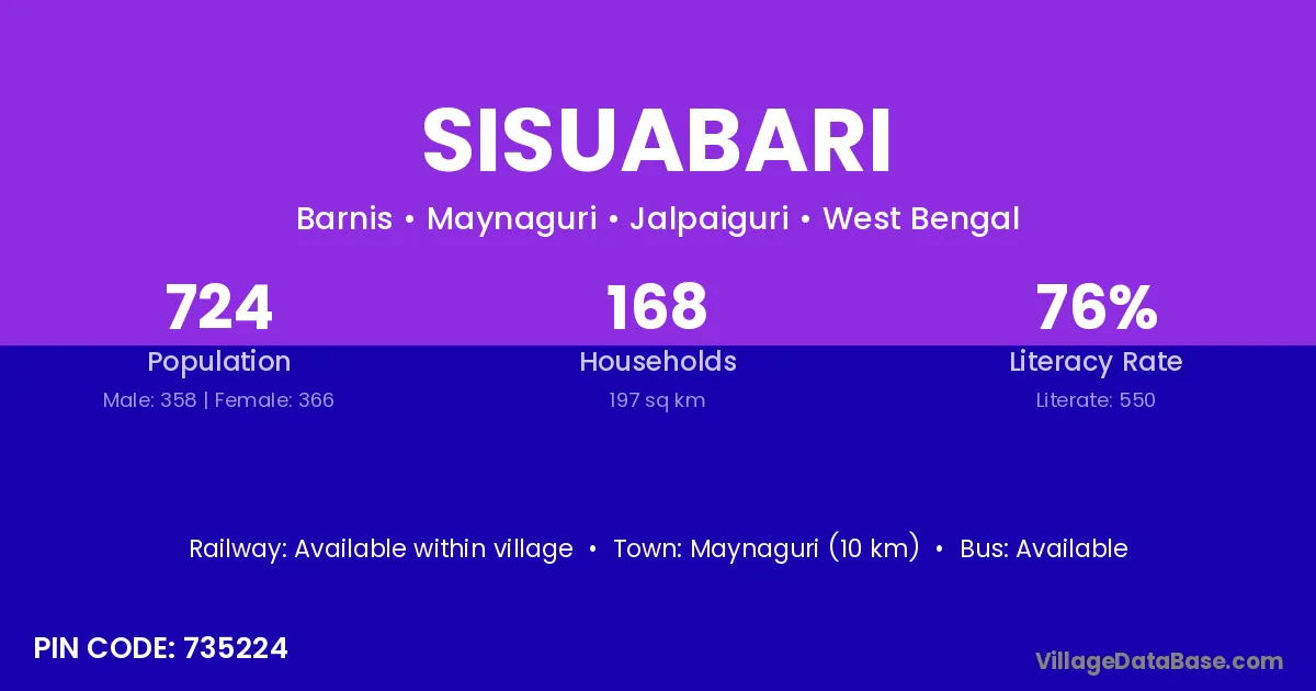 Maynaguri (10 km) is the nearest town to Sisuabari village for major economic activities and is located approximately 10 km away.