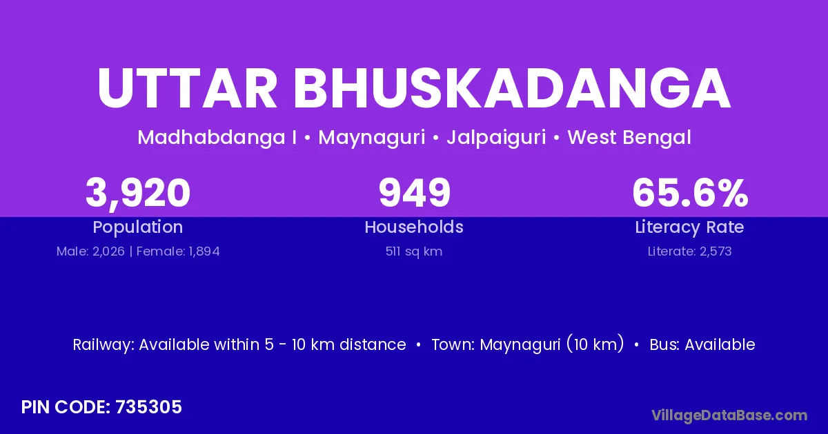 Maynaguri (10 km) is the nearest town to Uttar Bhuskadanga village for major economic activities and is located approximately 10 km away.