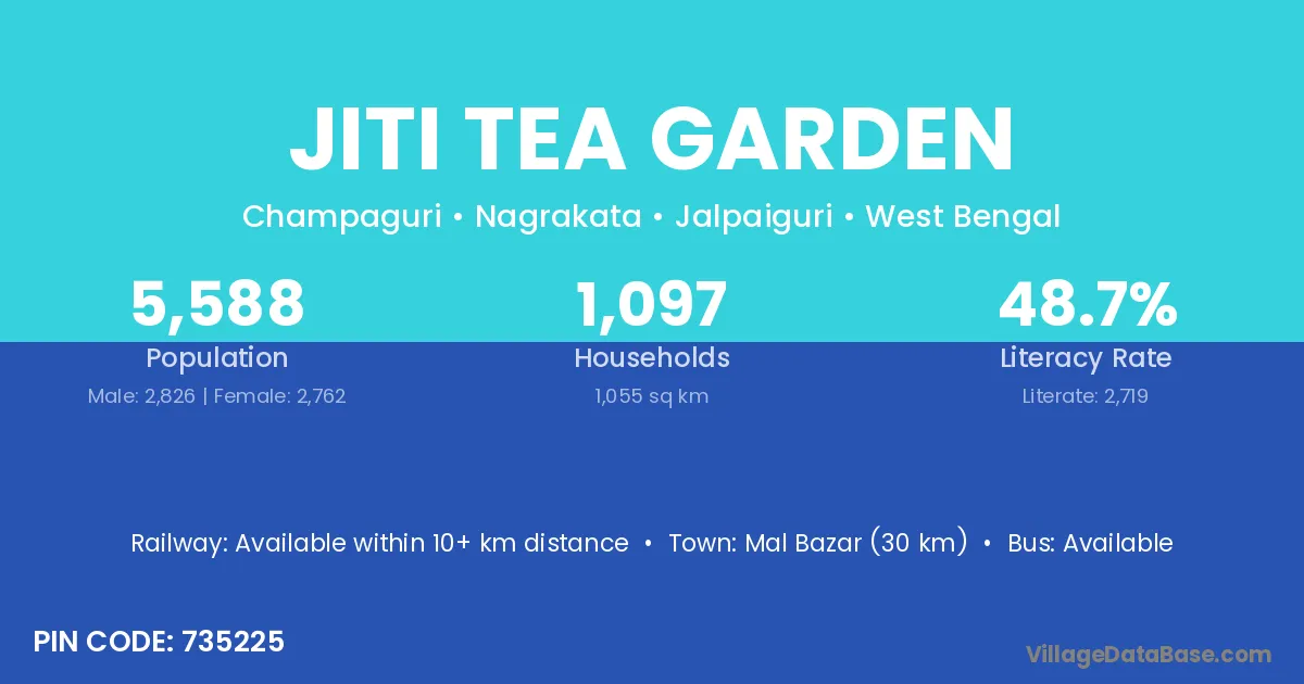 Mal Bazar (30 km) is the nearest town to Jiti Tea Garden village for major economic activities and is located approximately 30 km away.
