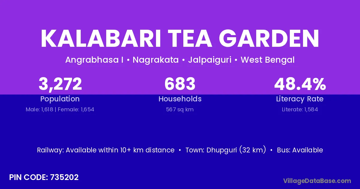 Dhupguri (32 km) is the nearest town to Kalabari Tea Garden village for major economic activities and is located approximately 32 km away.