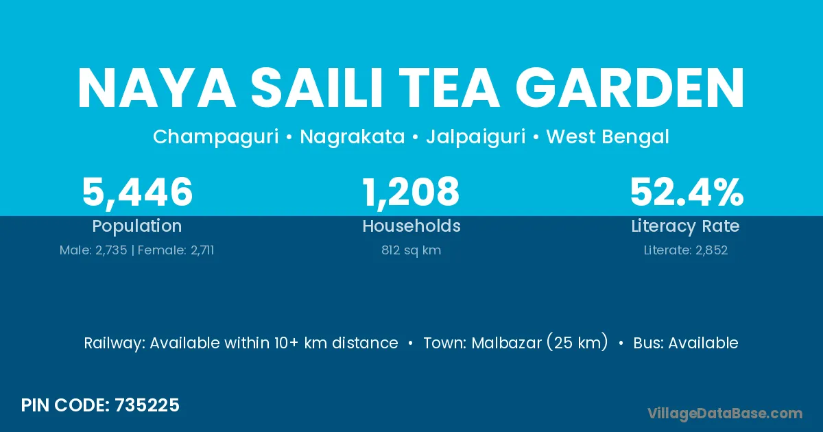 Malbazar (25 km) is the nearest town to Naya Saili Tea Garden village for major economic activities and is located approximately 25 km away.