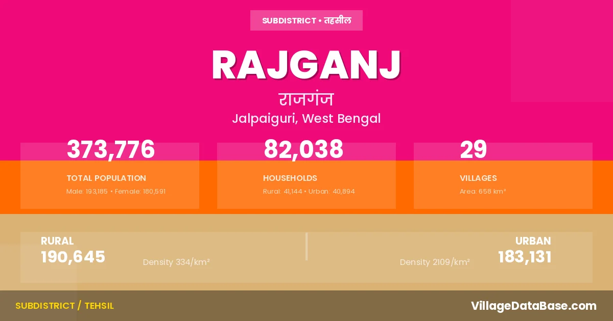 According to the 2011 census The total area of Rajganj Subdivision is 658 km², with a population of 373776 people. The population density is 568 inhabitants per square kilometre, and there are approximately 82038 houses in the sub district.