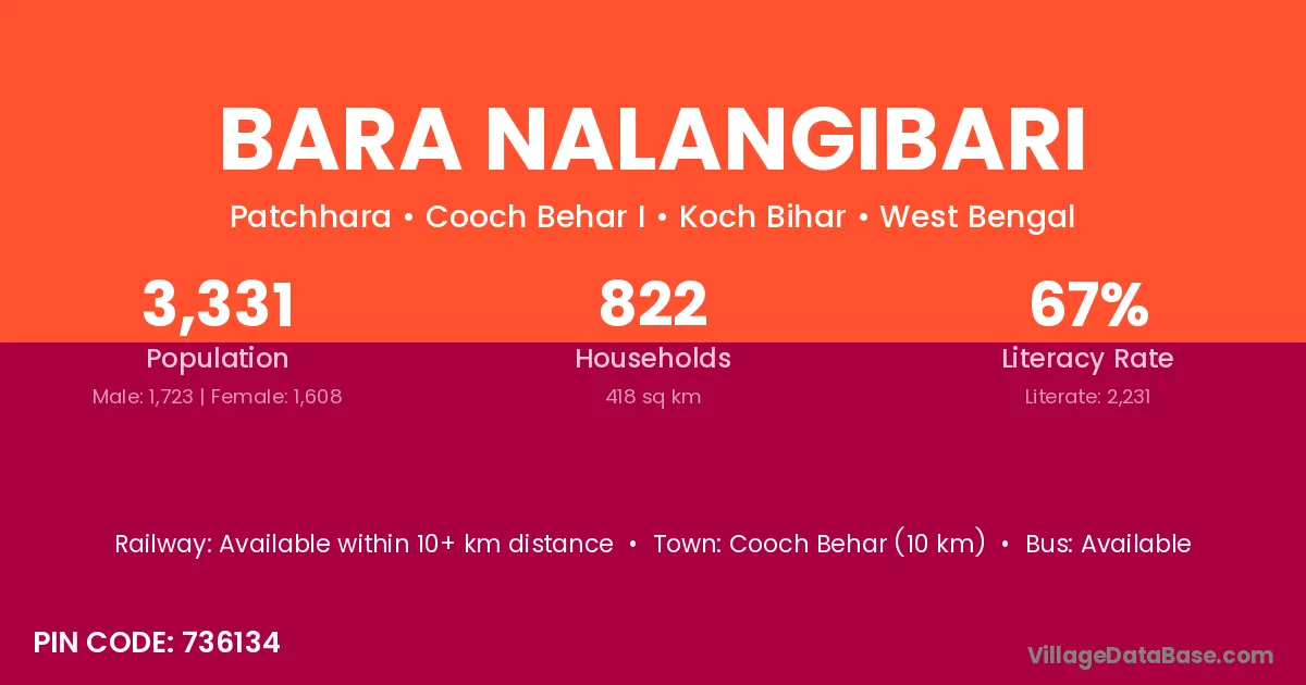 Cooch Behar (10 km) is the nearest town to Bara Nalangibari village for major economic activities and is located approximately 10 km away.