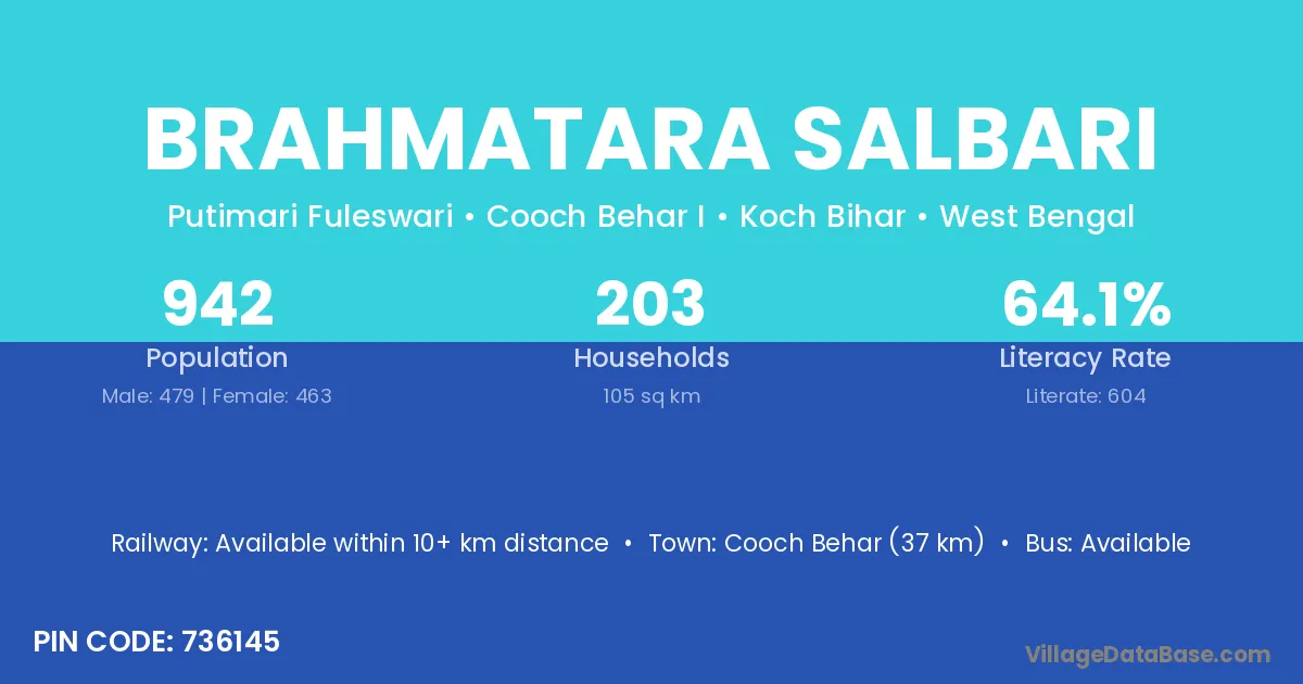 Cooch Behar (37 km) is the nearest town to Brahmatara Salbari village for major economic activities and is located approximately 37 km away.
