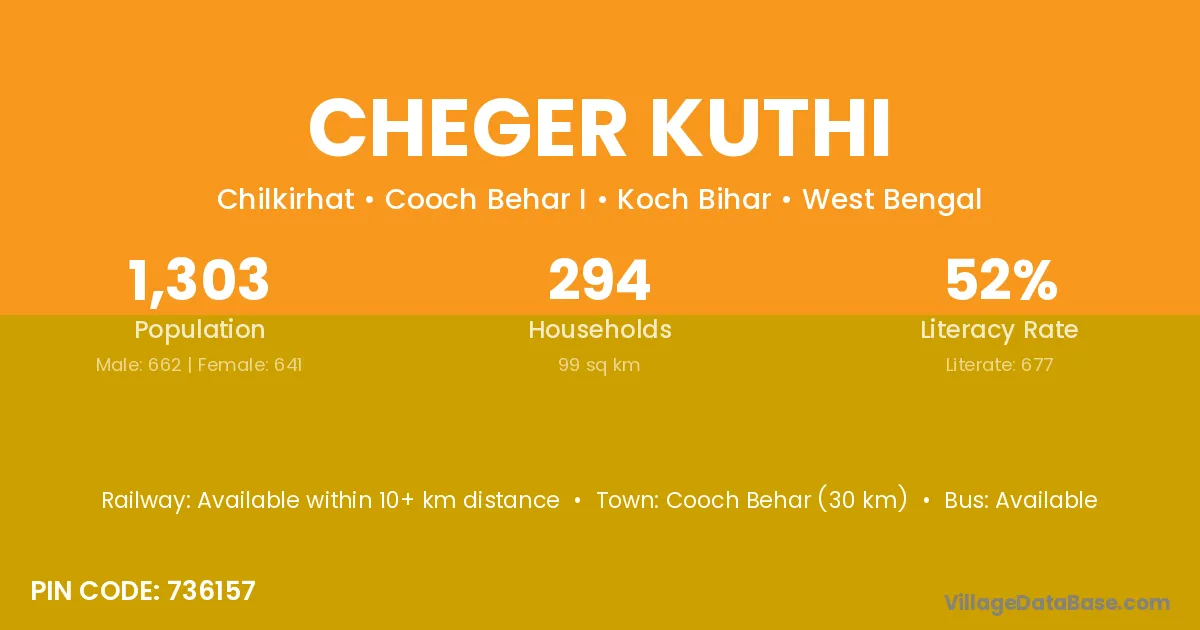 Cooch Behar (30 km) is the nearest town to Cheger Kuthi village for major economic activities and is located approximately 30 km away.