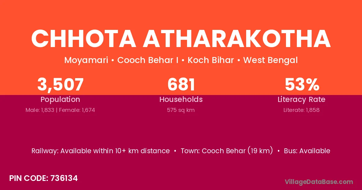 Cooch Behar (19 km) is the nearest town to Chhota Atharakotha village for major economic activities and is located approximately 19 km away.