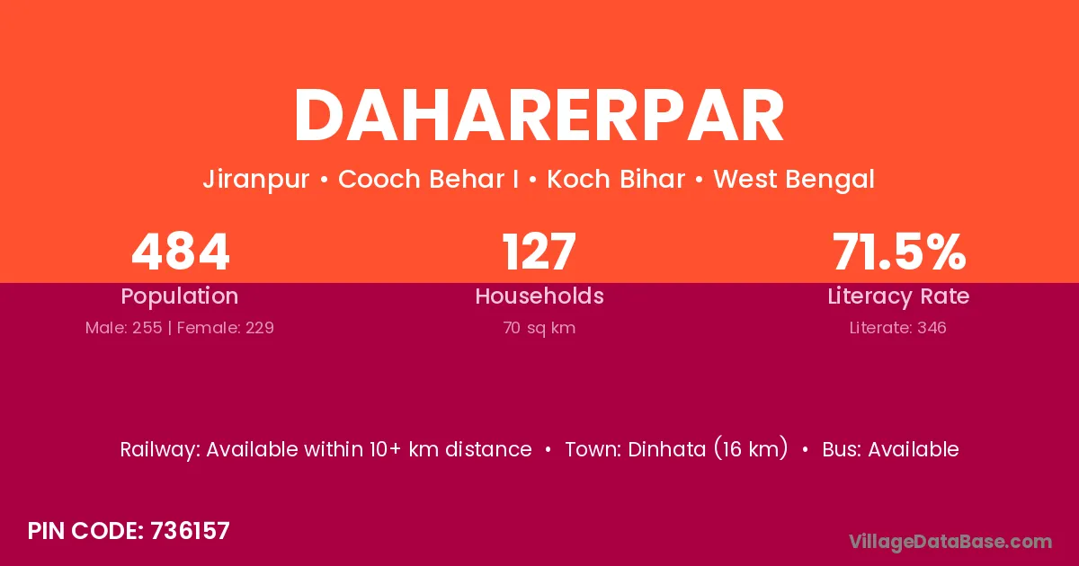 Dinhata (16 km) is the nearest town to Daharerpar village for major economic activities and is located approximately 16 km away.