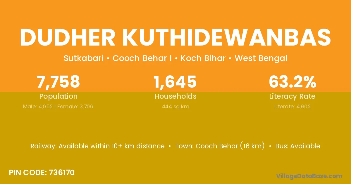 Cooch Behar (16 km) is the nearest town to Dudher Kuthidewanbas village for major economic activities and is located approximately 16 km away.