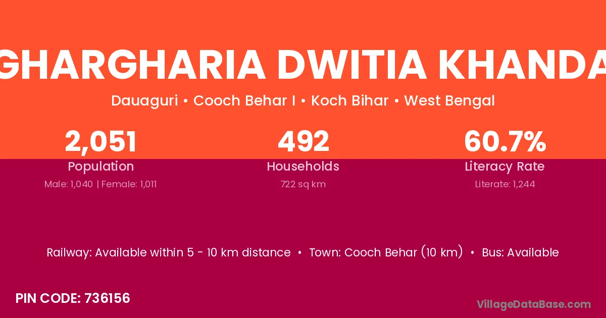 Cooch Behar (10 km) is the nearest town to Ghargharia Dwitia Khanda village for major economic activities and is located approximately 10 km away.
