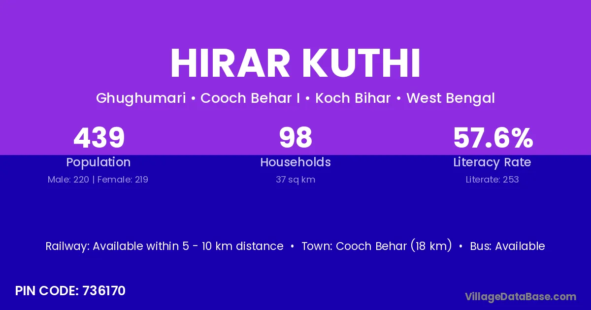 Hirar Kuthi village has a total population of 439 people, of which 220 are males and 219 are females.