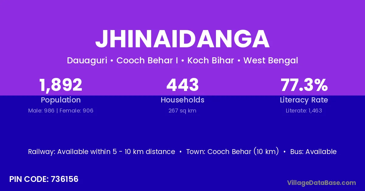 Cooch Behar (10 km) is the nearest town to Jhinaidanga village for major economic activities and is located approximately 10 km away.