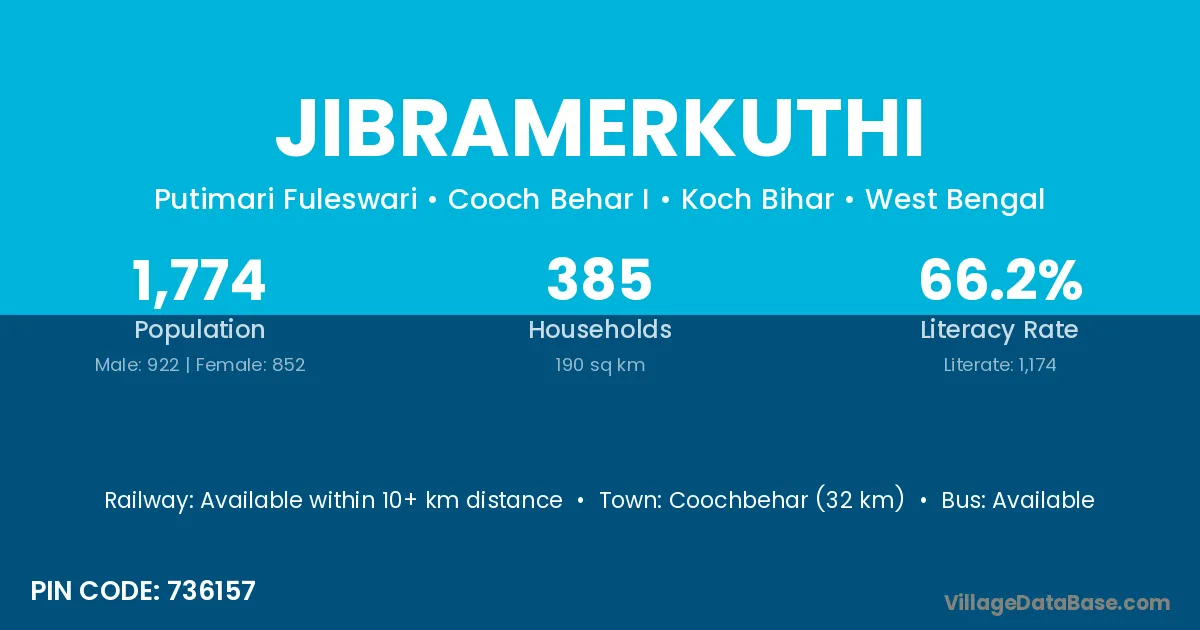 Coochbehar (32 km) is the nearest town to Jibramerkuthi village for major economic activities and is located approximately 32 km away.