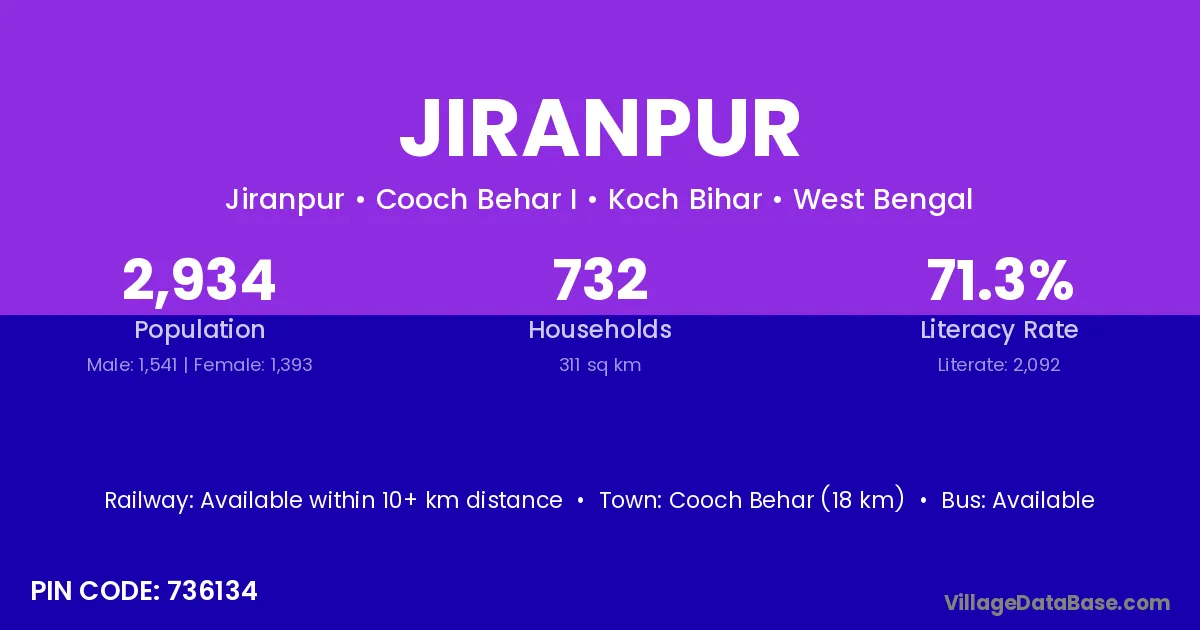 Cooch Behar (18 km) is the nearest town to Jiranpur village for major economic activities and is located approximately 18 km away.