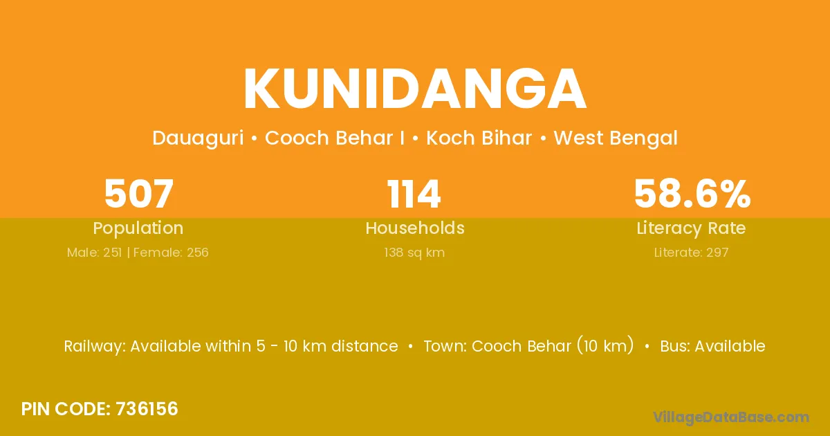 Cooch Behar (10 km) is the nearest town to Kunidanga village for major economic activities and is located approximately 10 km away.