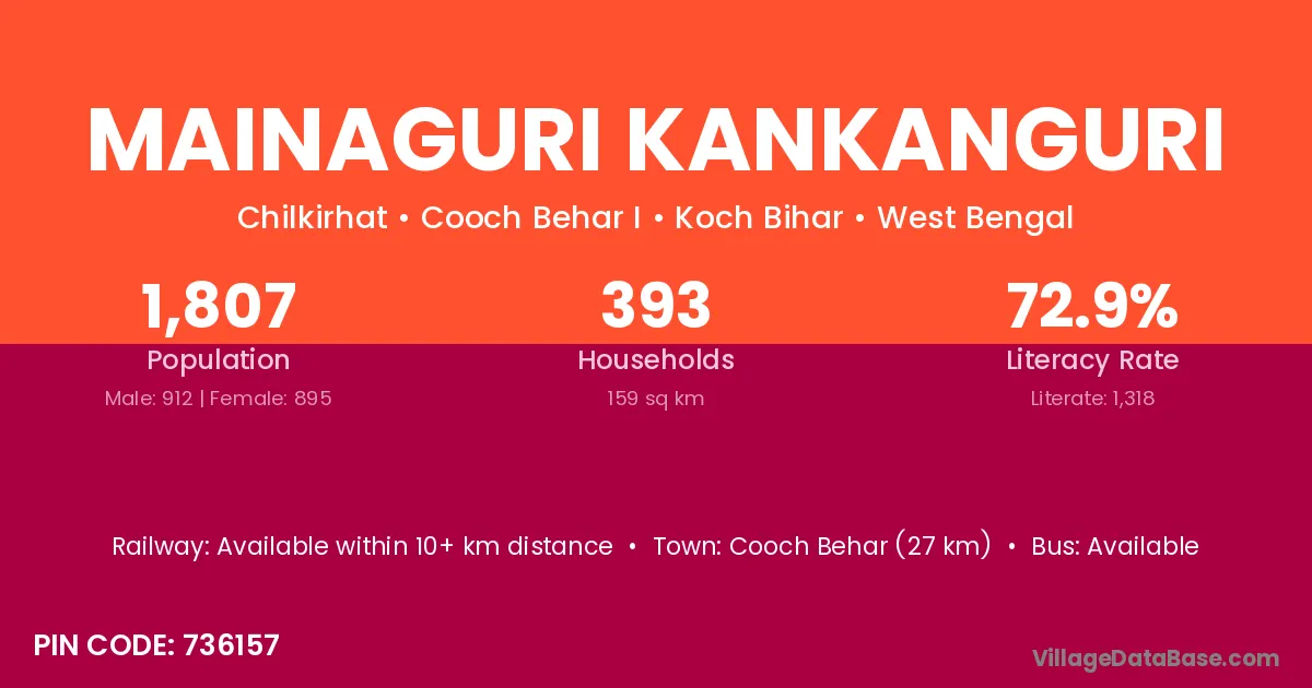Cooch Behar (27 km) is the nearest town to Mainaguri Kankanguri village for major economic activities and is located approximately 27 km away.