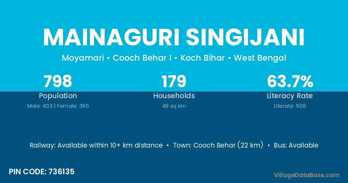 Cooch Behar (22 km) is the nearest town to Mainaguri Singijani village for major economic activities and is located approximately 22 km away.