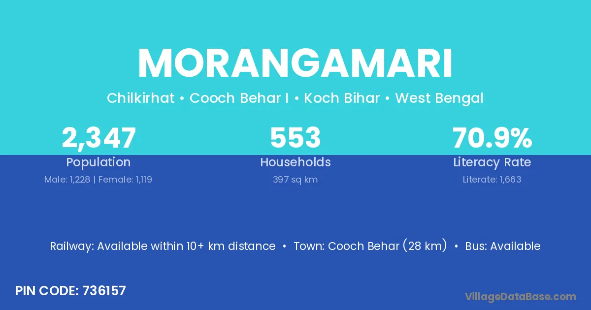 Cooch Behar (28 km) is the nearest town to Morangamari village for major economic activities and is located approximately 28 km away.