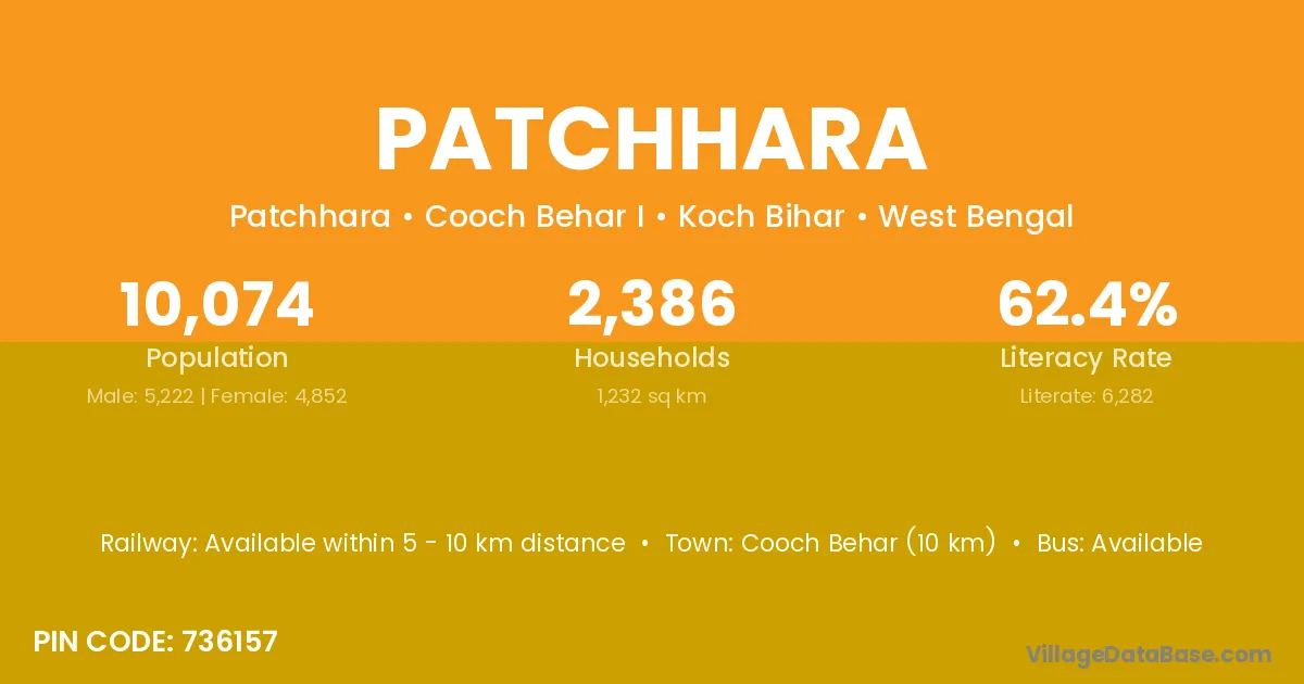 Cooch Behar (10 km) is the nearest town to Patchhara village for major economic activities and is located approximately 10 km away.