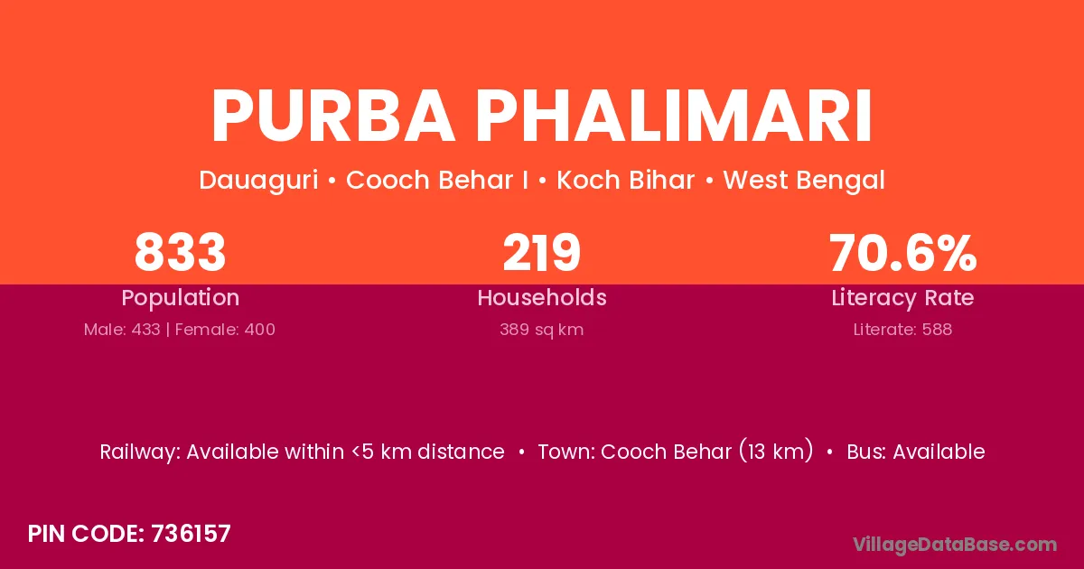 Cooch Behar (13 km) is the nearest town to Purba Phalimari village for major economic activities and is located approximately 13 km away.